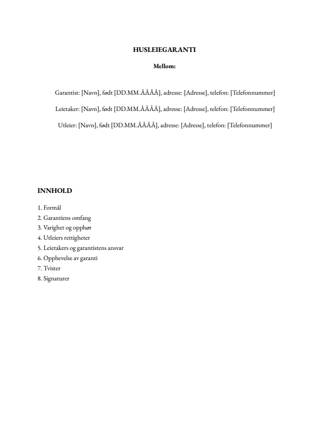 Denne malen for husleiegaranti gir utleier økonomisk trygghet dersom leietaker ikke betaler husleie, påfører skader eller misligholder avtalen. Den brukes ofte som alternativ til depositum – og fungerer som en skriftlig garanti mellom leietaker og en garantist (som regel foreldre, arbeidsgiver eller tredjepart).