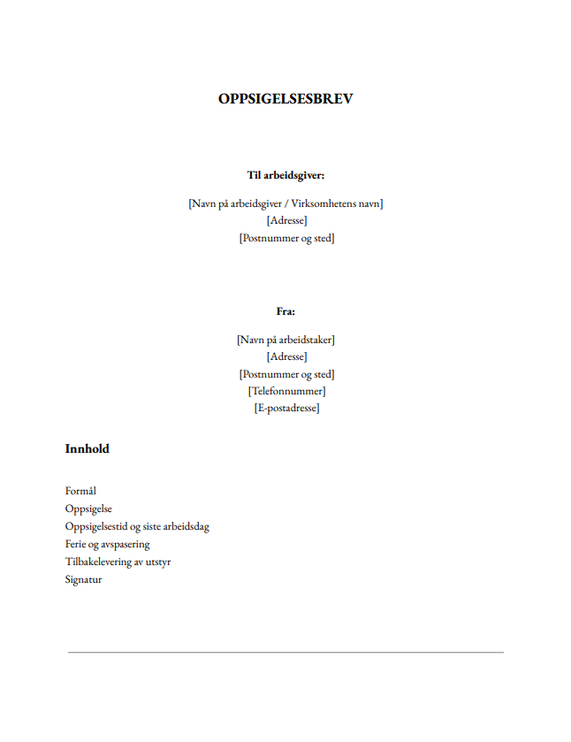 Denne malen for oppsigelsesbrev fra arbeidstaker hjelper deg å avslutte arbeidsforholdet ryddig og formelt – i tråd med både arbeidsmiljøloven og god praksis. Den er enkel å fylle ut og passer for alle typer stillinger i både privat og offentlig sektor.