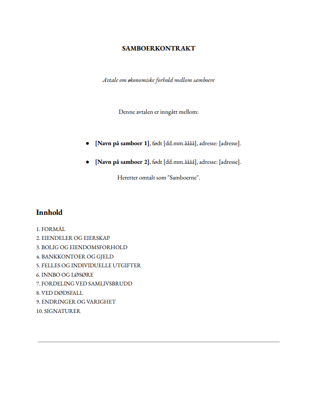 Denne samboeravtalen gir dere klare rammer for hvem som eier hva, hvordan utgifter skal fordeles, og hva som skjer hvis dere går fra hverandre. Malen passer for både nye og etablerte samboerpar, og er et viktig verktøy for å sikre rettferdighet og forutsigbarhet – uansett hvordan forholdet utvikler seg.